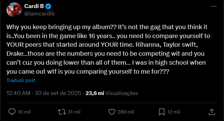 Cardi B não demorou a responder às provocações. Ela defendeu a beleza de sua filha e criticou Minaj por seus comentários, sugerindo que o comportamento da rival em relação ao filho dela, Papa Bear, poderia estar relacionado ao uso de substâncias. Cardi também fez referência a episódios passados, como o famoso confronto físico na Semana de Moda de Nova York em 2018, envolvendo as duas artistas.
