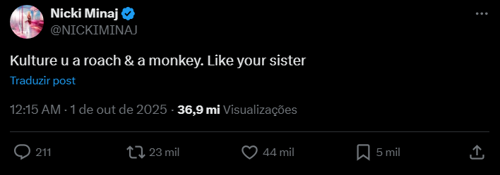 A rivalidade entre as rappers Nicki Minaj e Cardi B atingiu um novo patamar de hostilidade nas redes sociais. Em uma série de postagens no X (antigo Twitter), Nicki Minaj dirigiu insultos diretamente à filha de Cardi B, Kulture, de apenas sete anos. Em uma das mensagens, Minaj escreveu que a criança seria “uma macaca e uma barata”, comparando-a também com sua irmã mais nova.