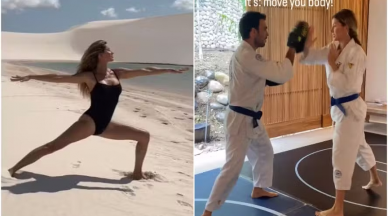 A modelo Gisele Bündchen, de 45 anos, compartilhou nesta quarta-feira (22) um vídeo mostrando sua rotina de atividades físicas. Além de aparecer se alongando na praia, fazendo aula de dança e surfando, ela apareceu praticando jiu-jitsu com o namorado, Joaquim Valente, 35.