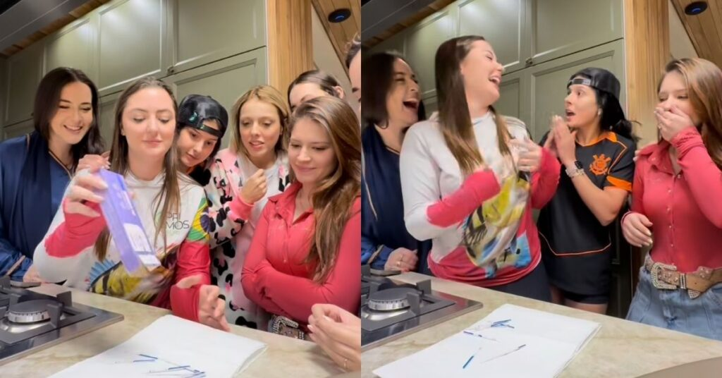 A dinâmica, que ficou conhecida como “roleta-russa da gravidez”, foi idealizada pela influenciadora Luana Abbeg. No vídeo, após todas realizarem o teste, um dos resultados aparece positivo. Ana reage em choque, visivelmente atônita. Em tom de humor, ela comenta: “Agora eu não sei se choro porque ela está grávida ou porque eu não estou”.