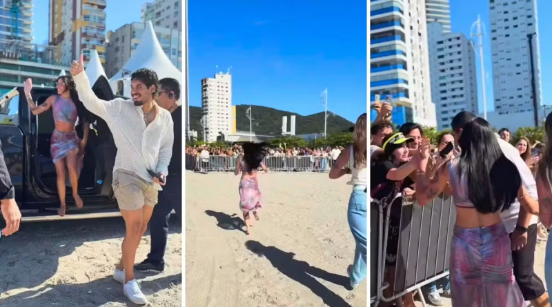 Ana Castela e Zé Felipe gravam na praia em Balneário Camboriú; cantora corre para encontrar fãs